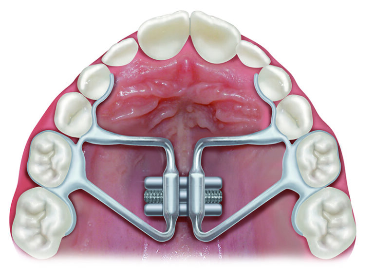 L’espansore rapido del palato è un dispositivo ortodontico/ortopedico che viene applicato all’arcata superiore. È composto da una struttura metallica che si ancora ai molari e presenta una vite centrale che viene attivata progressivamente.