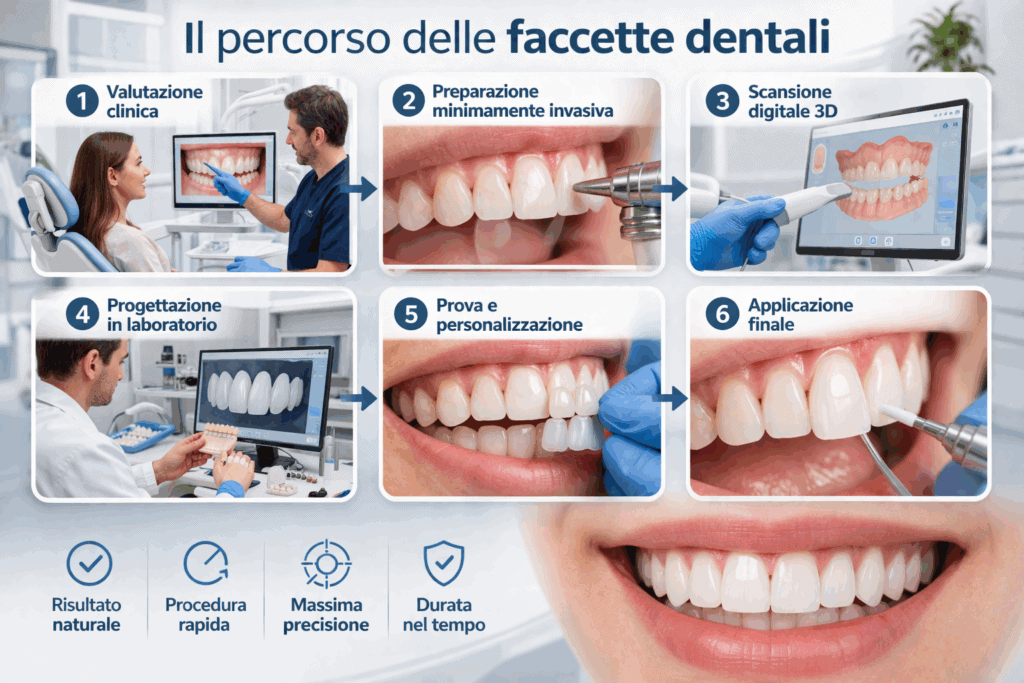 Il percorso che offriamo per le faccette dentali è strutturato per garantire a ogni paziente un risultato estetico ottimale e duraturo, basato su una valutazione clinica rigorosa e una pianificazione condivisa: